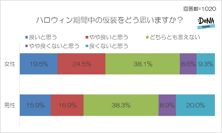 男女別で集計した結果、女性が男性より「良いと思う」(女性19.5%、男性15.9%)、「やや良いと思う」(女性24.5%、男性16.9%)の回答が上回っており、女性のほうが好意的に受け止めていることがわかります。しかし、「ハロウィンで仮装する異性をどう思いますか?」という質問に対しては男性のほうが女性より「良いと思う」(男性20.4%、女性15.9%)が上回っており、2つを照らし合わせると男性の仮装はあまり人気がなく、男女ともに女性の仮装を好意的にとらえていることが読み取れる結果となりました。