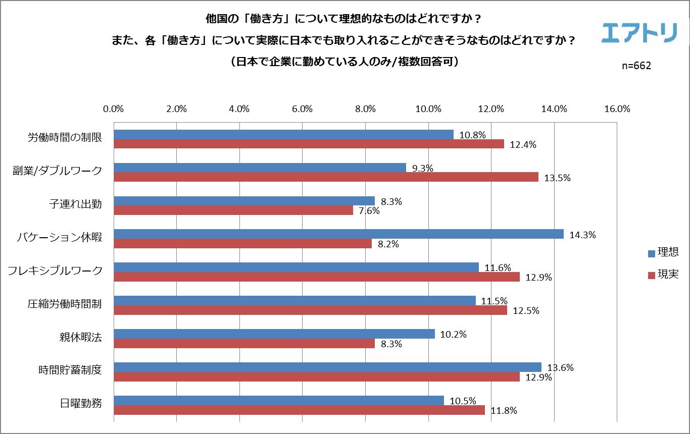 「理想的な働き方」の1位はブラジルの『バケーション休暇』(14.3%)でしたが、その一方で「実際に日本でも取り入れられそう」と答えた人は8.2%に留まりました。逆に「実際に日本でも取り入れられそう」な働き方の1位には『副業/ダブルワーク』(13.5%/ベトナム等)となりましたが、「理想的な働き方」だと思う人は9.3%となり、いずれも理想と現実に乖離が出ました。