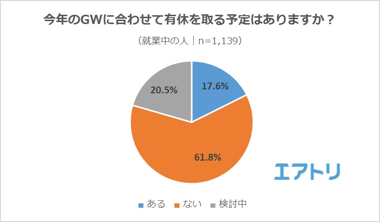 就業中の人に対し、今年のGWに合わせて有休を取る予定があるかどうかを聞いたところ、予定が「ある」と回答したのは17.6%だったのに対し、「ない」は61.8%と過半数を占めました。昨年は暦上でも10連休だったにも関わらず、21.2%の人が更に有休を取る予定だと回答しており、有休取得者は減少となりました。