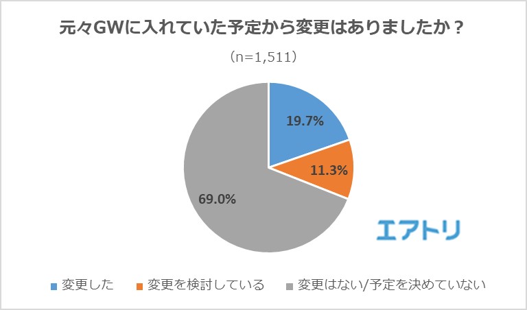 「変更した」と回答したのが19.7%、「変更を検討している」が11.3%と約3割が予定を変更した、あるいは変更する可能性を示唆しました。